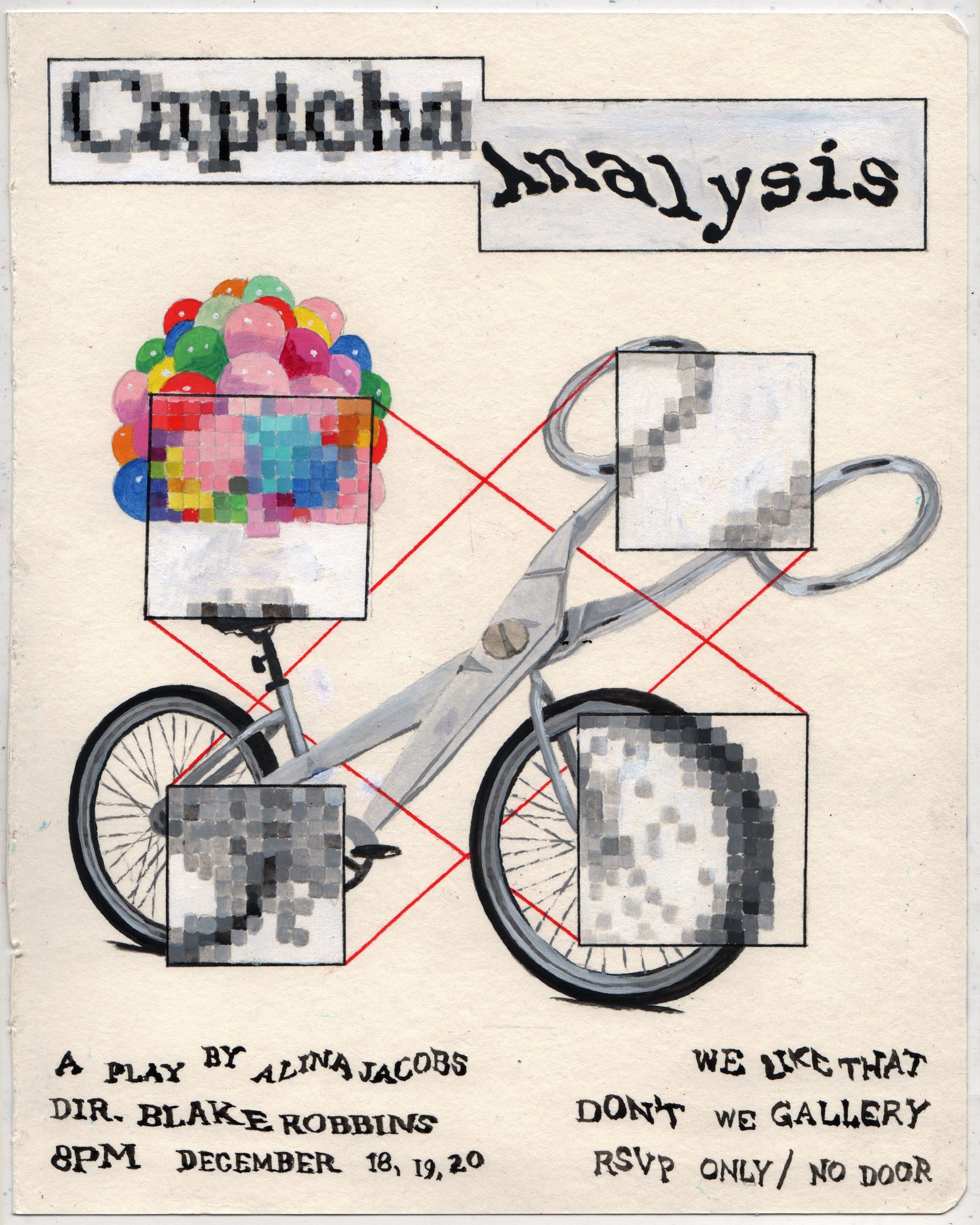 CAPTCHA Analysis (v.1) A new play about keys and scissors by Alina Jacobs, directed by Blake Robbins with Alina Jacobs, Madeline Friedman, and Blake Robbins. Music composed and performed by Mallory Baker. Costumes by Drew Hubert. Sound design by Donna Allen. Artwork by Jake Tobin. 65 minutes. (venue is up two flights of stairs) RSVP only! No tickets will be available at door!